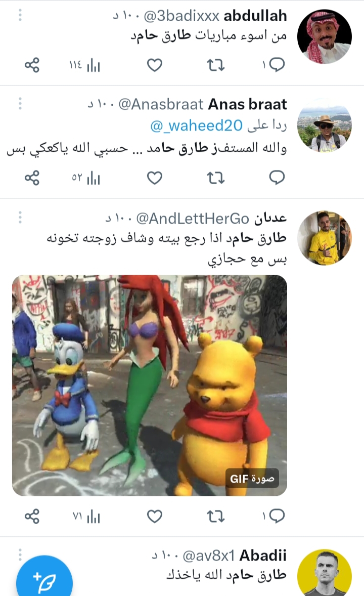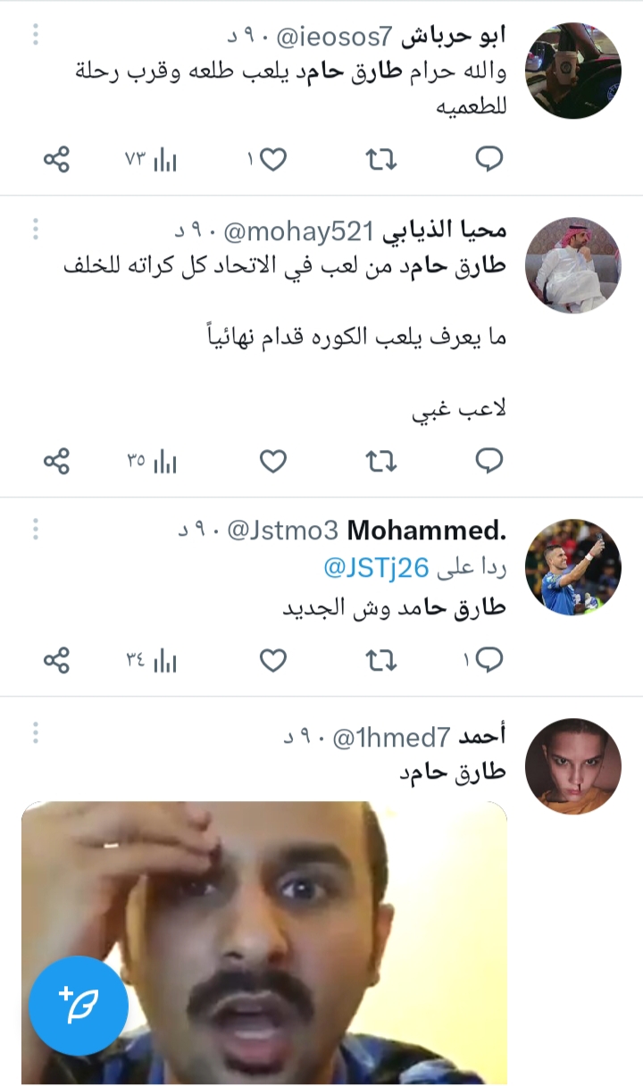 وأبدى جماهير اتحاد جدة، استيائهم من مستوى طارق حامد، وتمريراته خلال مباراة الفريق أمام الفيحاء، في المباراة المقامة حاليًا بينهما، ليطالبوا برحيله عن الفريق.