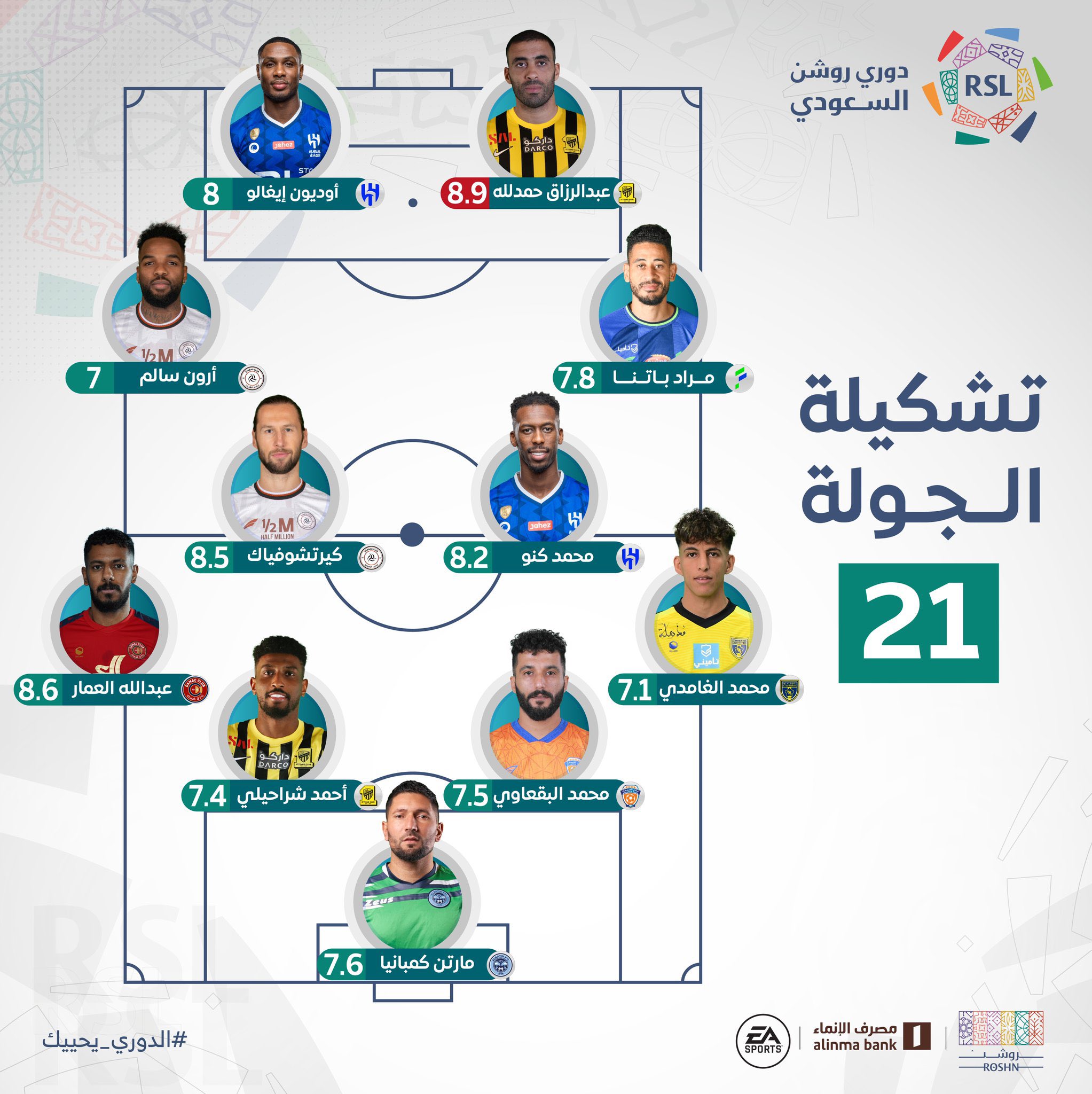 وضمت التشكيلة الأفضل في الجولة الحادية والعشرين من بطولة الدوري السعودي للمحترفين، عبدالرزاق حمدالله، لاعب اتحاد جدة، والذي حصل على أعلى تقييم بين اللاعبين.