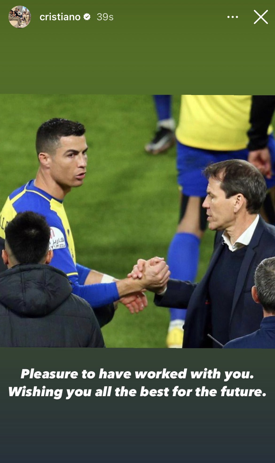 وجه البرتغالي كريستيانو رونالدو، لاعب الفريق الأول لكرة القدم بنادي النصر السعودي، رسالة خاصة إلى المدير الفني الفرنسي رودي جارسيا، بعد رحيله عن تدريب العالمي بشكل رسمي.