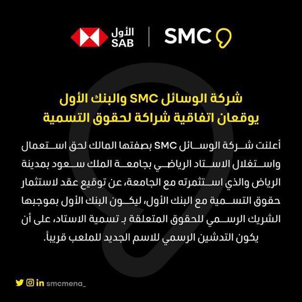 وقامت شركة الوسائل المسئولة عن ملعب استاد جامعة الملك سعود، التابع لنادي النصر، بالتوقيع مع بنك ساب وسيتم تسمية الملعب قريبًا.