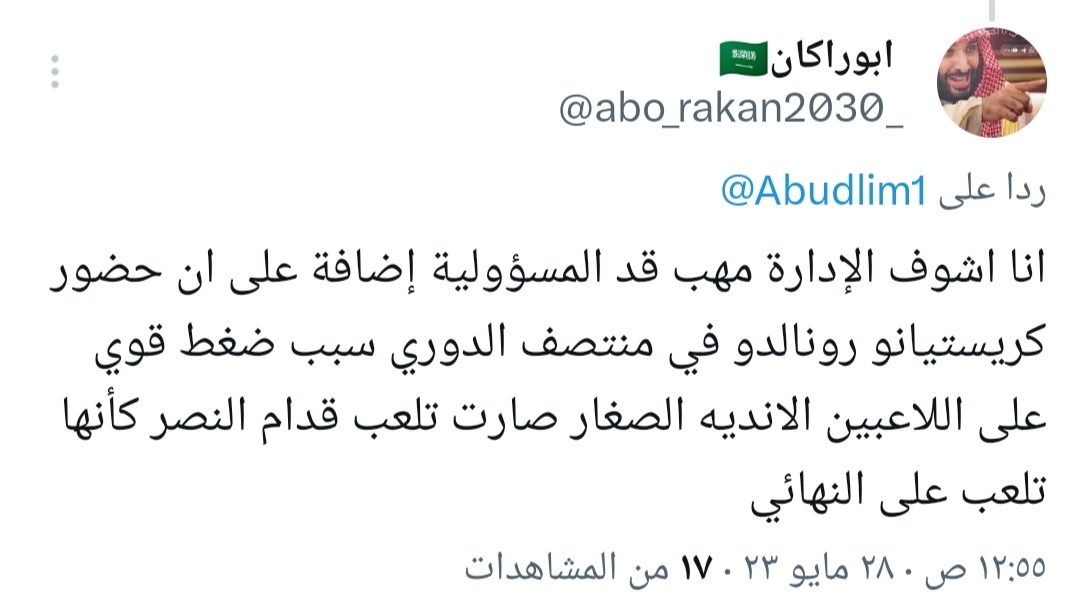 وأضاف آخر: “أنا أشوف الإدارة ليست على قدر المسؤولية، إضافة على أن حضور كريستيانو رونالدو في منتصف الدوري سبب ضغط قوي على اللاعبين الأنديه الصغار صارت تلعب قدام النصر كأنها تلعب على النهائي”.