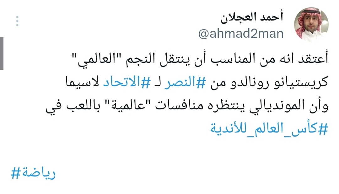 وكتب الناقد الرياضي أحمد العجلان: “أي تاريخ يقدمه الدون، أعتقد انه من المناسب أن ينتقل النجم “العالمي” كريستيانو رونالدو من النصر لـ الاتحاد لاسيما وأن المونديالي ينتظره منافسات “عالمية” باللعب في كأس العالم للأندية.