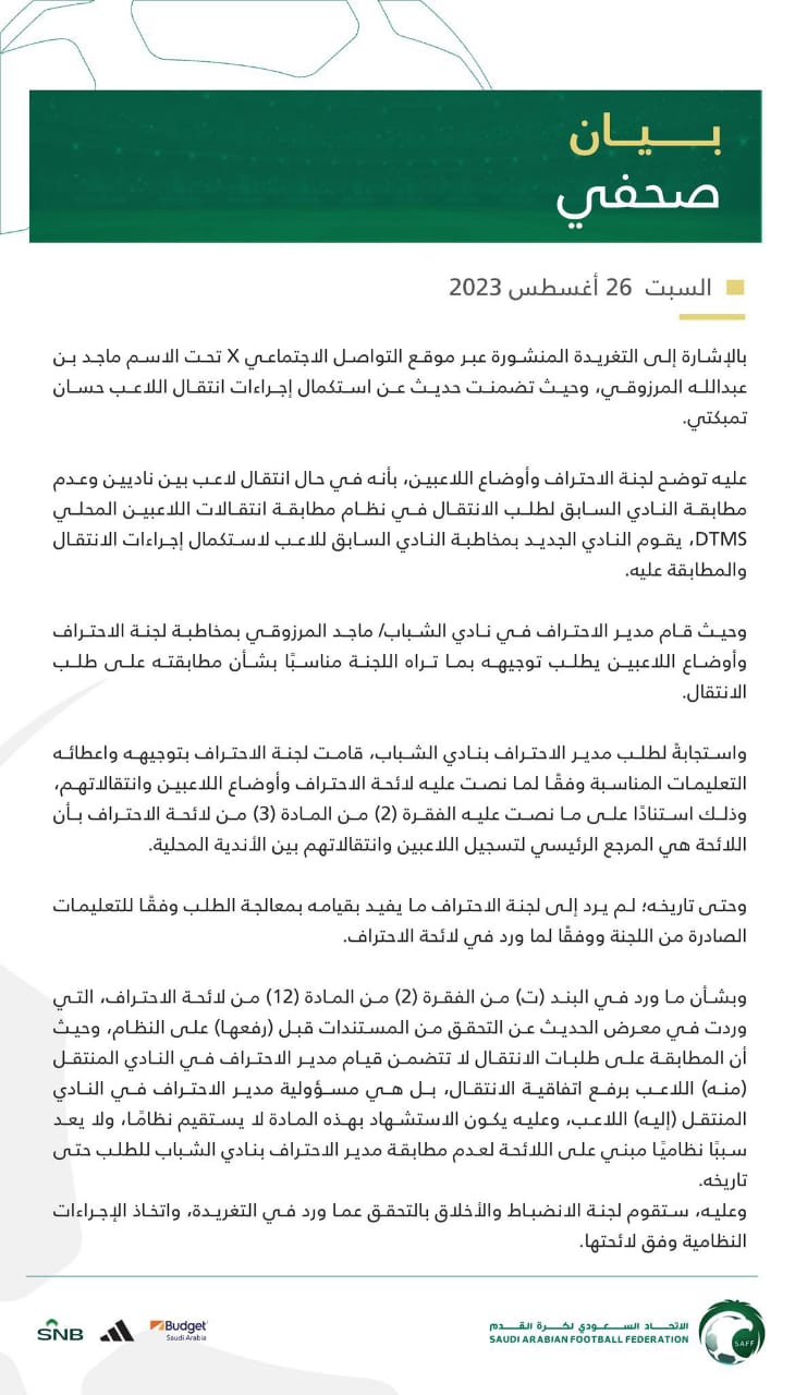 بالإشارة إلى التغريدة المنشورة عبر موقع التواصل الاجتماعي تحت الاسم ماجد بن عبدالله المرزوقي، وحيث تضمنت حديث عن استكمال إجراءات انتقال اللاعب حسان تمبكتي.