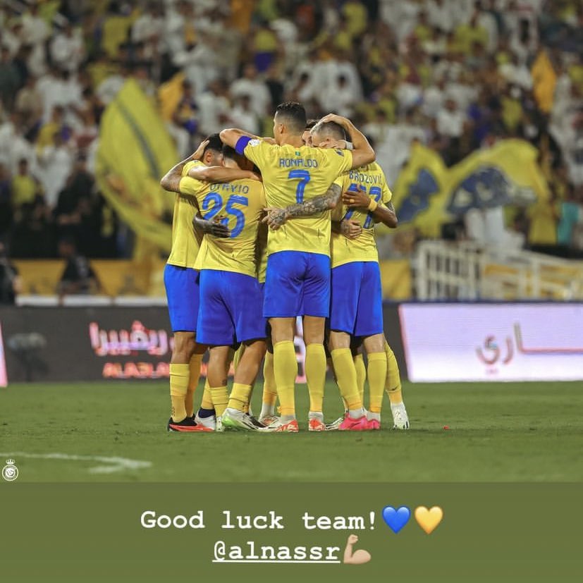 ونشر رونالدو، صورة له مع النصر السعودي، عبر حسابه الرسمي على موقع التواصل الاجتماعي انستجرام، وكتب: “بالتوفيق فريقي”.