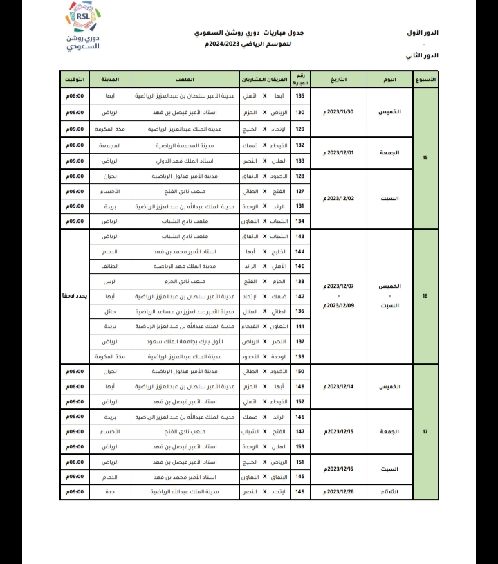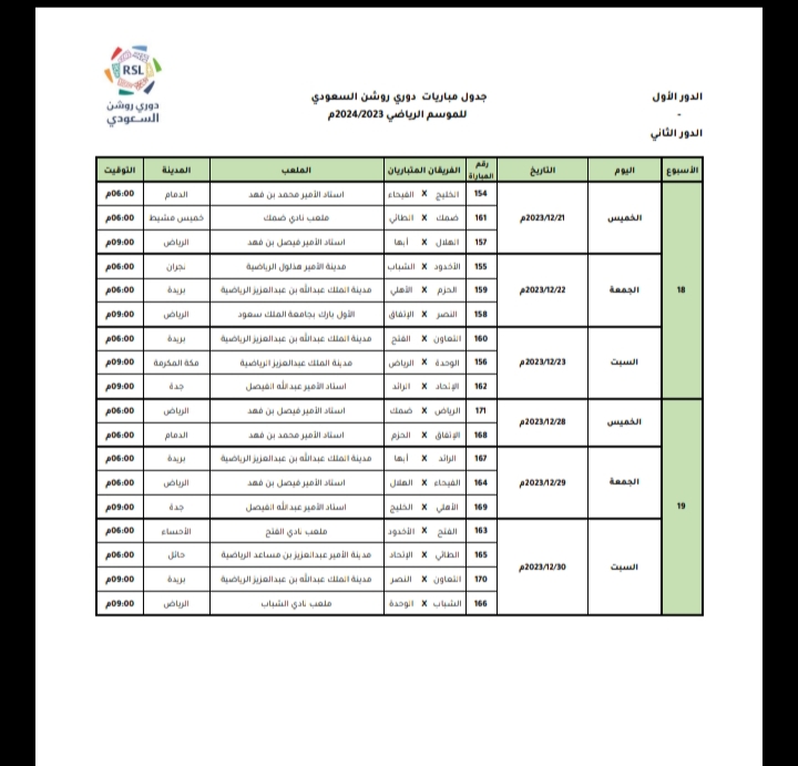 وكشفت رابطة الدوري السعودي للمحترفين، عن مواعيد مباريات 8 جولات، بداية من الجولة الثانية عشر وحتى التاسعة عشر.