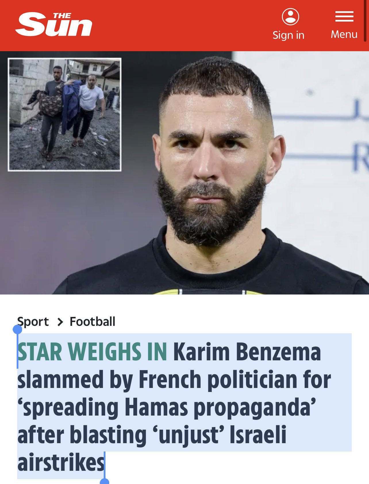 وكان بنزيما قد أعلن تضامنه مع مع غزة، حيث كتب عبر حسابه الشخصي على موقع التواصل الاجتماعي “تويتر”،: “كل صلواتنا من أجل سكان غزة الذين يقعون مرة أخرى ضحايا لهذه القصف الظالم الذي لا يستثنى النساء ولا الأطفال”.