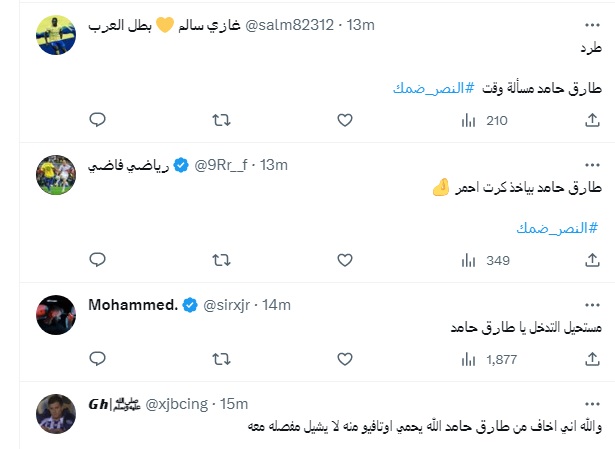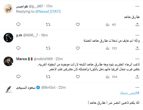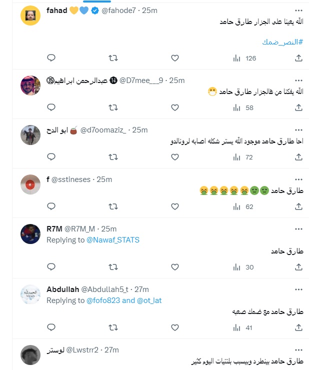 وحذر آخر لاعبو النصر من تدخلات طارق حامد قائلًا: “والله اني خايف من تدخلات طارق حامد الخشنة”، ورد عليه آخر: “الله يكفي لاعبين النصر شر ( طارق حامد )”.