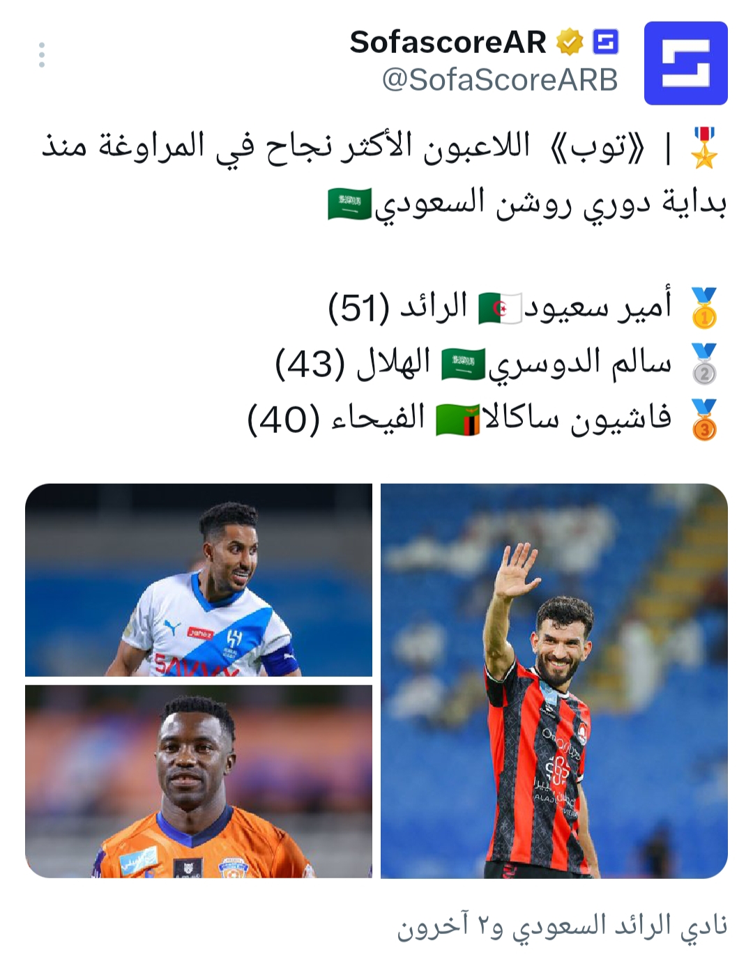 تفوق الجزائري، أمير سعيود، لاعب نادي الرائد، على الثنائي البرتغالي كريستيانو رونالدو والفرنسي كريم بنزيما نجمي النصر واتحاد جدة على الترتيب، في مسابقة دوري روشن السعودي.