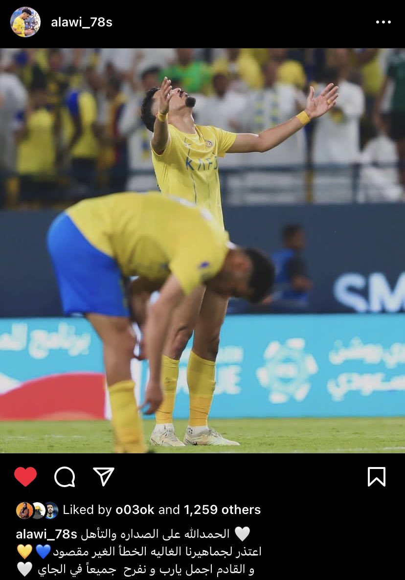 وكتب لاجامي لاعب النصر السعودي عبر حسابه الرسمي على موقع التواصل الاجتماعي انستجرام: “الحمدلله على الصدارة والتأهل، اعتذر لجماهيرنا الغالية الخطأ الغير مقصود والقادم أجمل ويارب نفرح جميعًا في اللي جاي”.