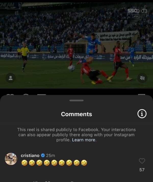 وعلق كريستيانو على فيديو تم تداوله على موقع الصور والفيديوهات “إنستجرام”، لضربة الجزاء الثانية المحتسبة لصالح الهلال، بإضافة “إيموجي” ضاحك يدل على السخرية.