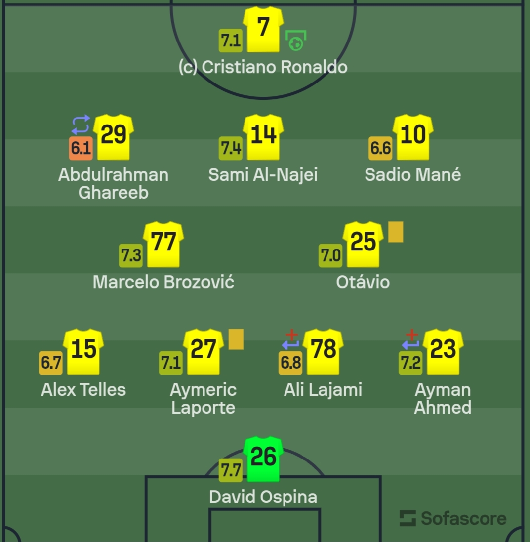 وحصل رونالدو على تقييم 7.1، بينما كان عبد الرحمن غريب، أسوأ لاعبي الفريق في اللقاء بتقييم 6.1، يليه ساديو ماني بـ6.6.