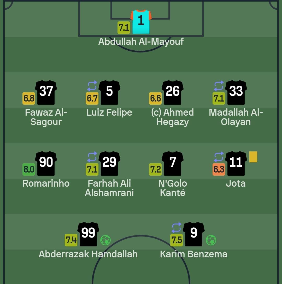 الهجوم: كريم بنزيما – عبدالرازق حمد الله – رومارينهو.