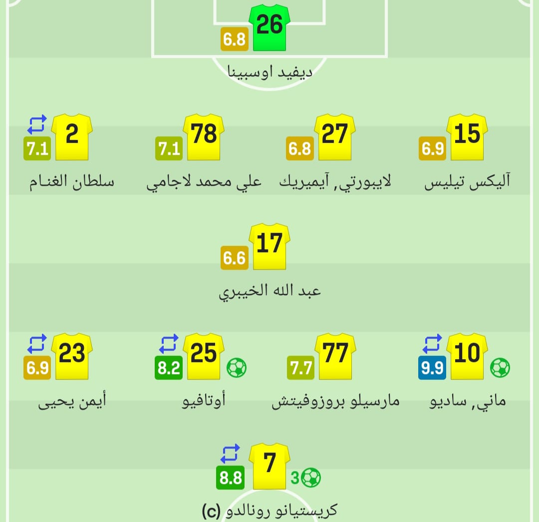 وجاءت دقة تمريرات مهاجم النصر 74%، واللمسات 39، وفرص خطيرة ضائعة 1، وخسر الحياز 12.