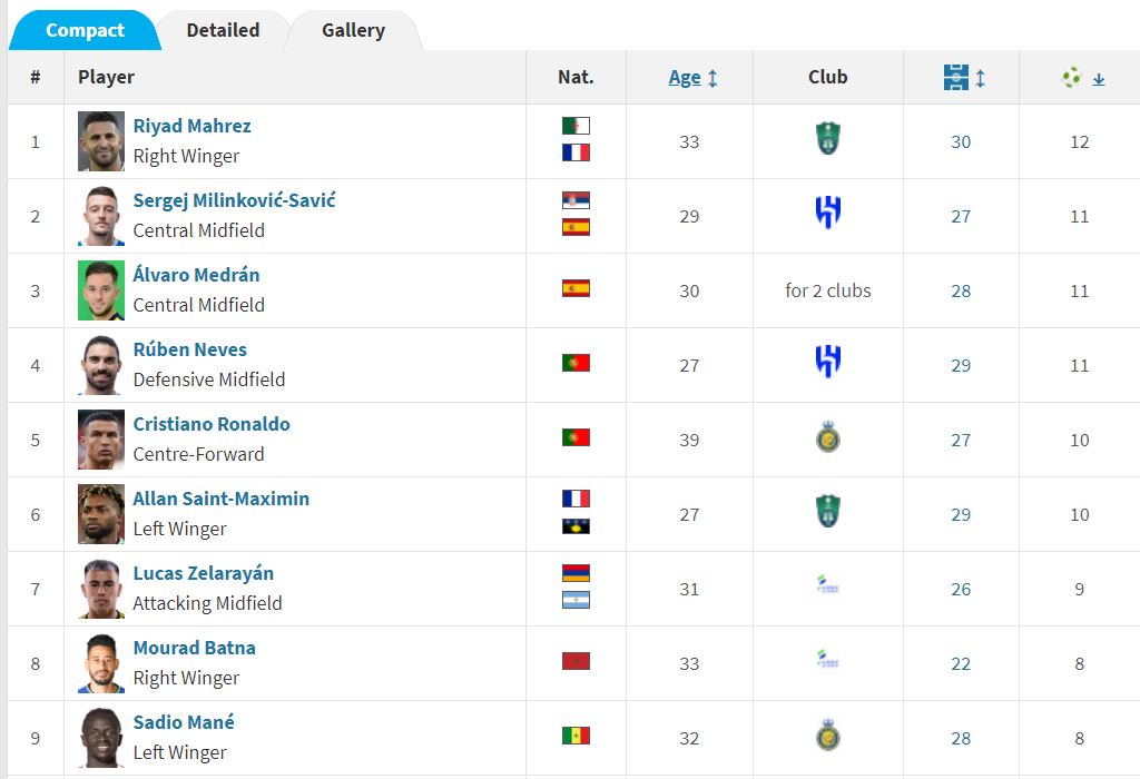 ويأني في المركز الثاني خلف المتصدر رياض محرز، كل من؛ ثنائي الهلال سيرجي سافيتش وروبن نيفيز، بالإضافة إلى ألفارو ميدران لاعب وسط الاتفاق الحالي والتعاون السابق برصيد 11 هدفا.