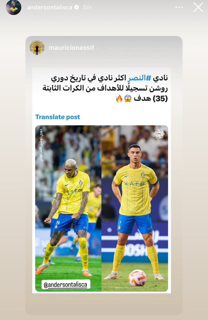 ونشر البرازيلي أندرسون تاليسكا، عبر حسابه الرسمي على موقع التواصل الاجتماعي انستجرام، صورة للانجاز التاريخي الذي حققه نادي النصر السعودي.