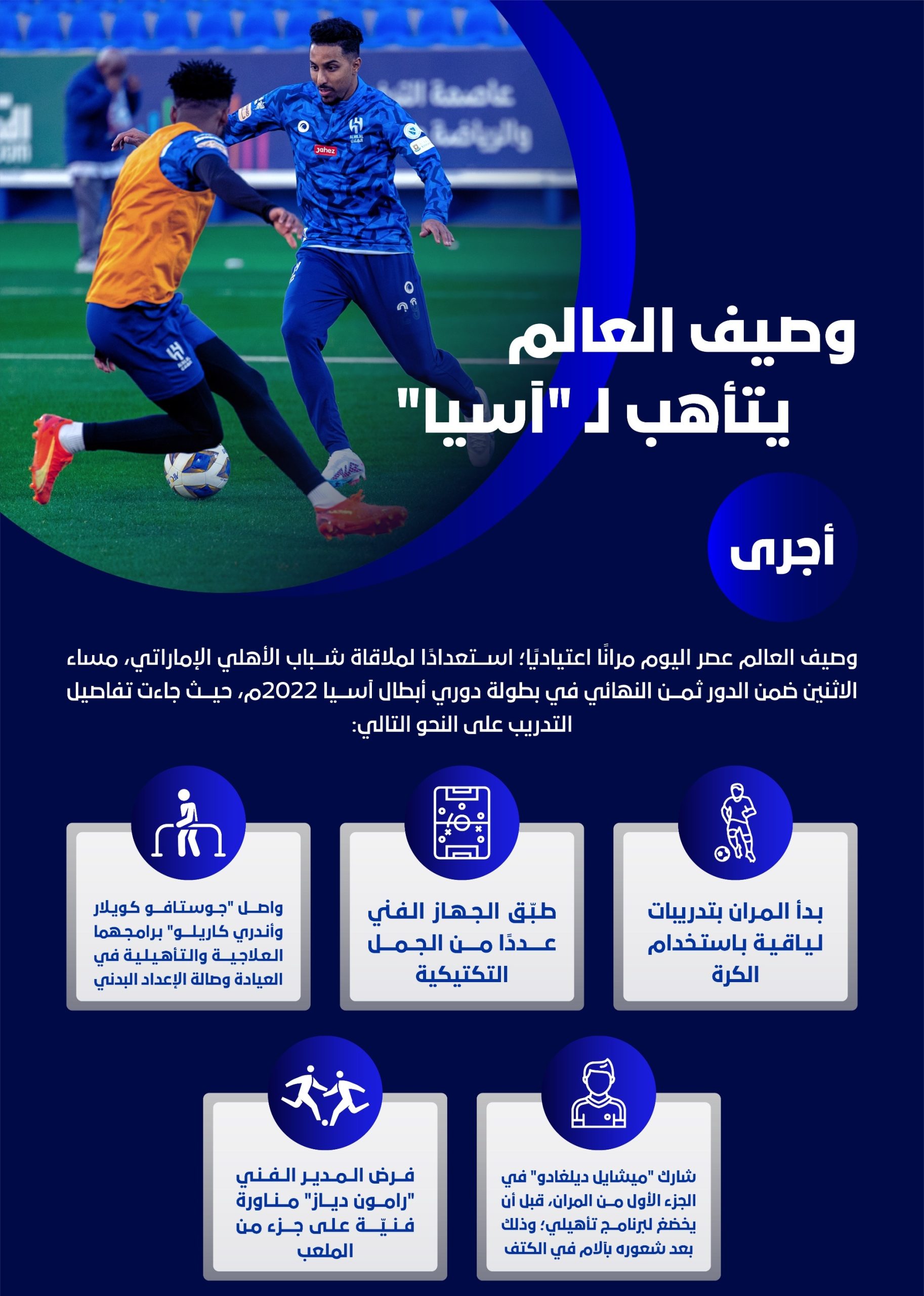ضربت صفوف الفريق الأول لكرة القدم بنادي الهلال السعودي إصابة جديدة، قبل مباراة شباب الأهلي دبي الإماراتي، في دور الـ 16 من بطولة دوري أبطال آسيا.