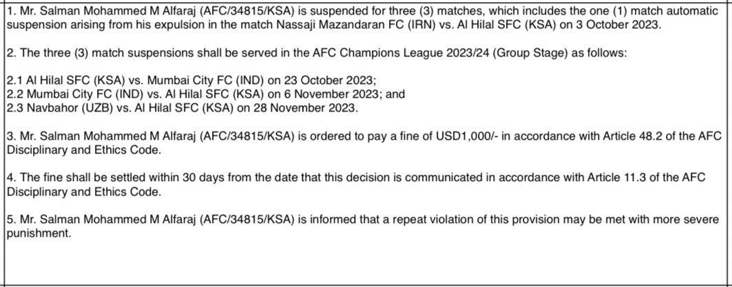 وقرر الاتحاد الآسيوي إيقاف سلمان الفرج 3 مباريات، وتشمل عقوبة الإيقاف التلقائي، بعد تلقيه بطاقة حمراء في مباراة ناساجي.