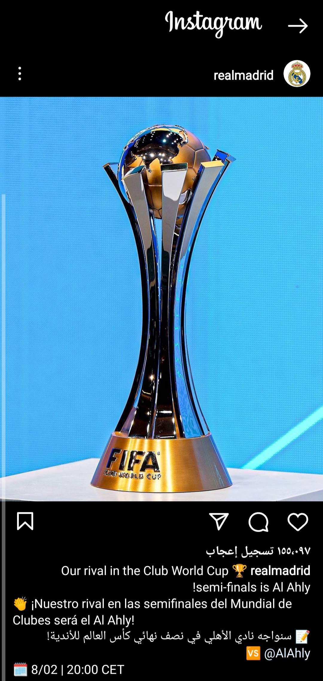 وشارك ريال مدريد جماهيره عبر موقع التواصل الاجتماعي “إنستجرام”، صورة لجائزة بطولة مونديال الأندية، وعلق عليها :”سنواجه النادي الأهلي في نصف نهائي كأس العالم للأندية”، ثم قام بالاشارة إلى حساب “مزيف”.