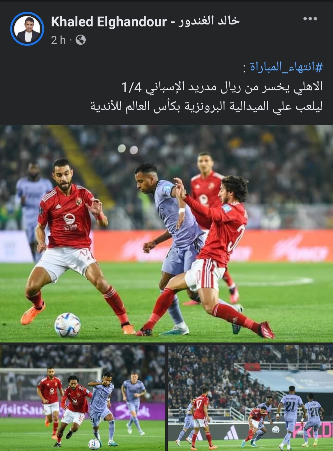 بينما كتب خالد الغندور نجم الزمالك السابق عبر صفحته على فيسبوك: ” :الاهلي يخسر من ريال مدريد الإسباني 1/4.. ليلعب علي الميدالية البرونزية بكأس العالم للأندية.”