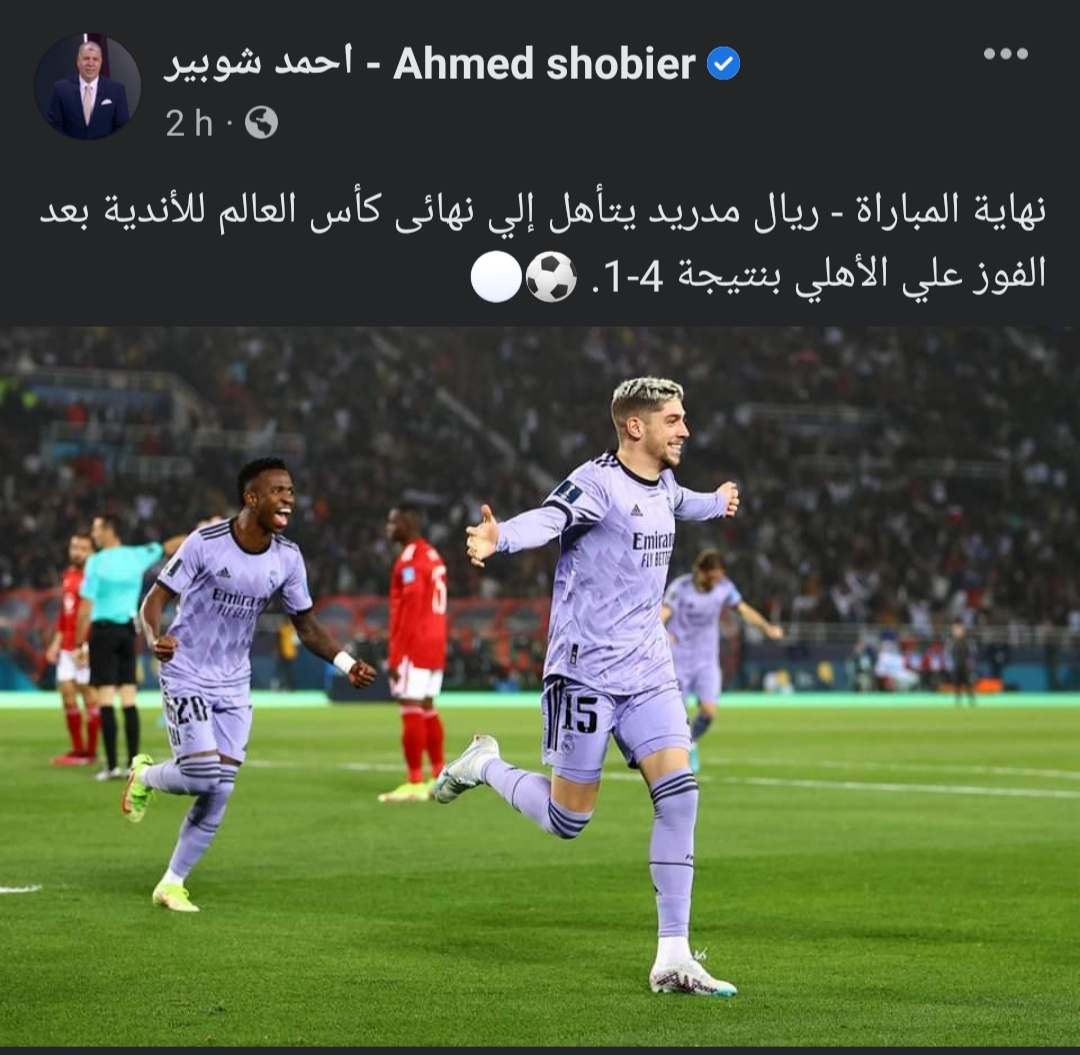 وكتب شوبير عبر حسابه الشخصي على موقع التواصل الإجتماعي فيسبوك: ” نهاية المباراة – ريال مدريد يتأهل إلي نهائى كأس العالم للأندية بعد الفوز علي الأهلي بنتيجة 4-1.”