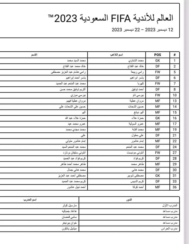 وتأتي قائمة الاهلي المشاركة في كأس العالم للأندية على النحو التالي: