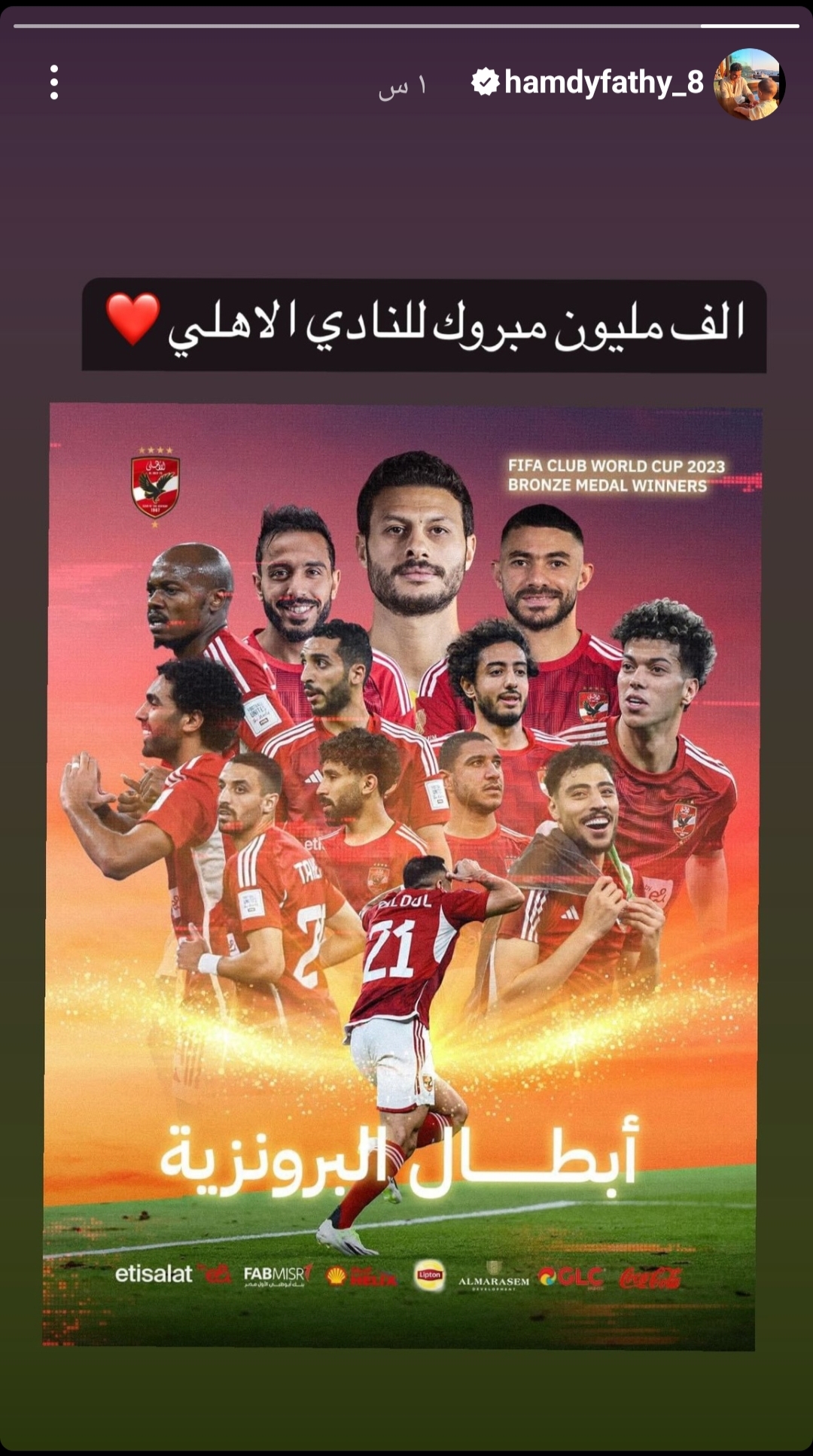 ونشر حمدي فتحي لاعب الوكرة القطري، عبر حسابه الشخصي على موقع التواصل الاجتماعي “إنستجرام”، صورة لـ الفريق بعد حصد البرونزية، وكتب:” ألف مبروك للنادي الاهلي”.