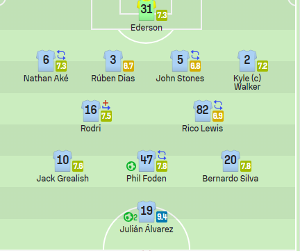 ويليه فيل فودين وبرناردو سيلفا بتقييم 7.8 لكل منهما، جاك جريليش ورودري على معدل 7.5، ثم ناثان آكاي وايدرسون بتقييم 7.3 لكل منهما، وحصل والكر على تقييم 7.2، وحصل ريكو لويس على تقييم 6.9، ثم جون ستونز 6.8
