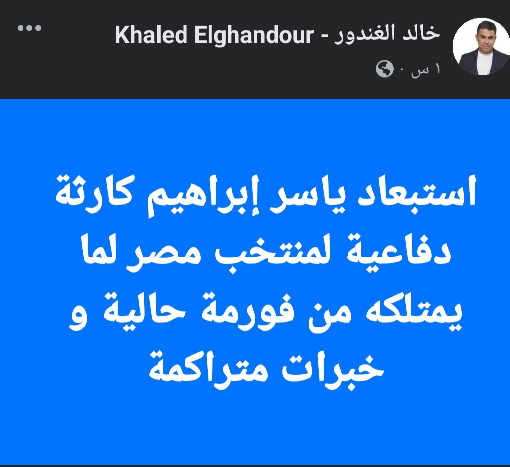 وكتب الغندور عبر حسابه الرسمي على موقع التواصل الاجتماعي “فيس بوك”:”استبعاد ياسر إبراهيم كارثة دفاعية لمنتخب مصر لما يمتلكه من فورمة حالية و خبرات متراكمة”.