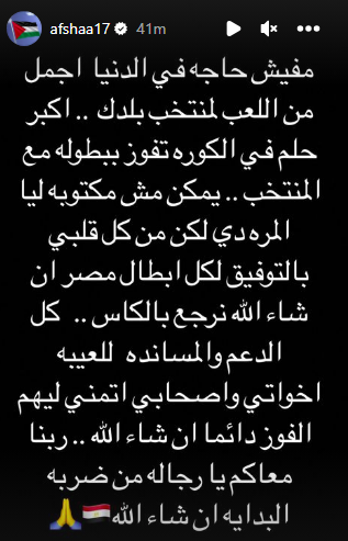 وأضاف أفشة:” يمكن مش مكتوبة ليا المرة دي، لكن من كل قلبي بالتوفيق لكل أبطال مصر إن شاء الله نرجع بالكأس “.