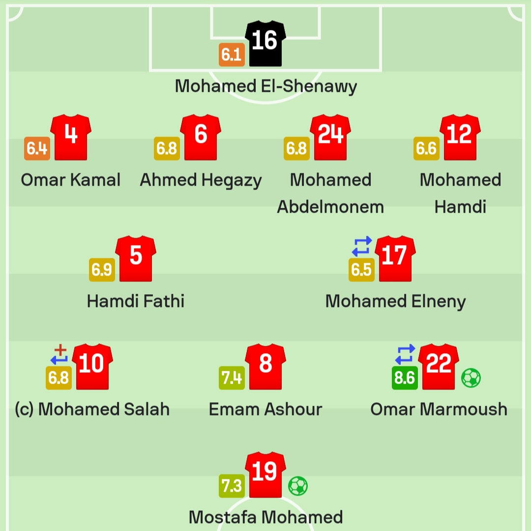 كما جاءت أرقام كل من، محمد صلاح نجم ليفربول الإنحليزي، والمدافع أحمد حجازي، ومحمد عبد المنعم في مباراة مصر وغانا بدرجو 6.8، فيما حصل حمدي فتحي على تقييم 6.9.