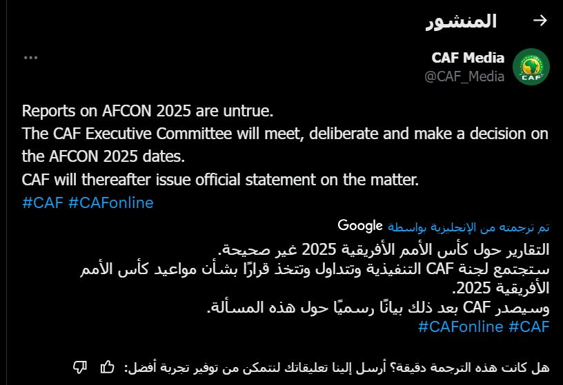 وجاء البيان الرسمي للاتحاد الأفريقي لكرة القدم “كاف”: “التقارير حول كأس الأمم الأفريقية 2025 غير صحيحة”.