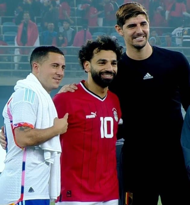 داعب الحارس البلجيكي تيبو كورتوا محمد صلاح نجم منتخب مصر ونادي ليفربول الإنجليزي، عقب مباراة الفراعنة الودية أمام بلحيكا.