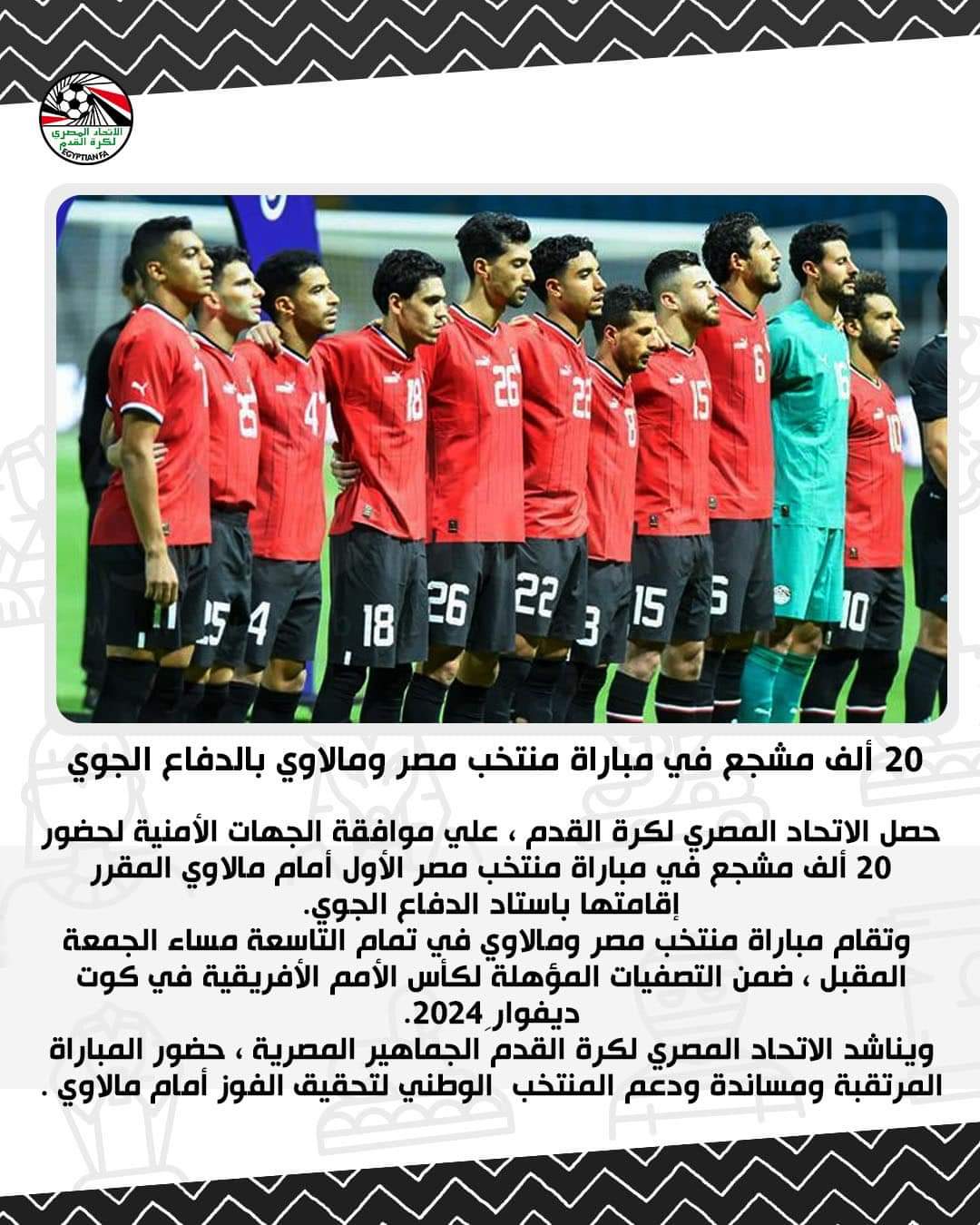 أعلن الاتحاد المصري لكرة القدم موافقة الجهات الأمنية على حضور 20 ألف مشجع في مباراة منتخب مصر أمام مالاوي، والتي ستقام على ستاد الدفاع الجوي.