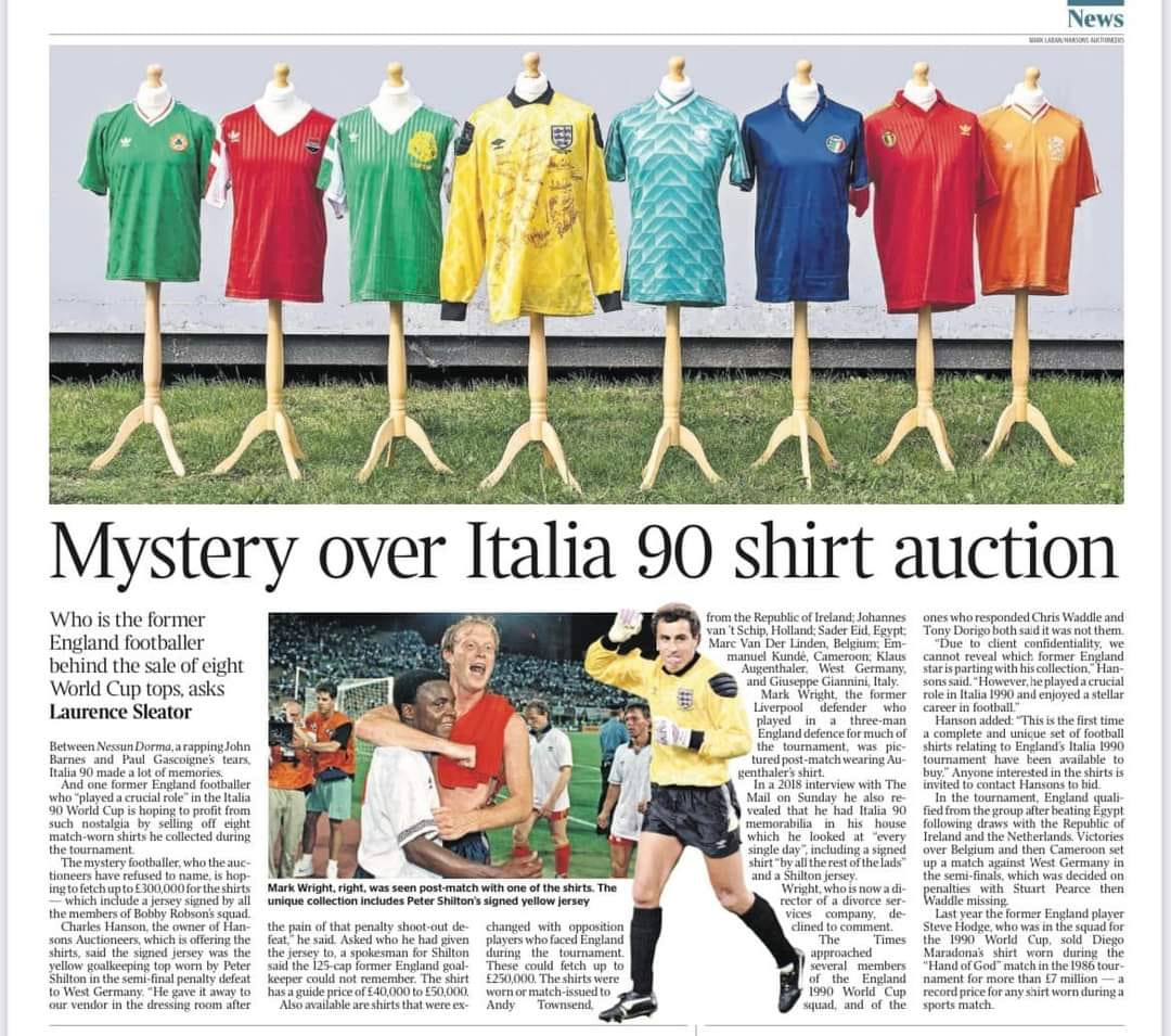 نجم منتخب إنجلترا من جيل كأس العالم 1990 الذي رفض الكشف عن هويته، قرر عرض 8 قمصان استبدلها مع المنتخبات التي واجهها في مشوار منتخب بلاده بهذه النسخة من المونديال للبيع مقابل 300 ألف جنيه إستيرليني.