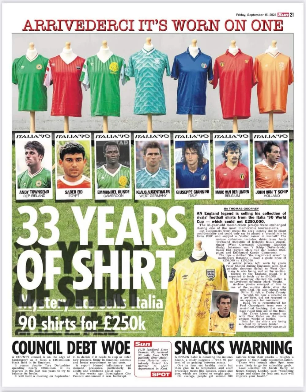 اللاعب تعاون مع إحدى شركات المزادات الشهيرة من أجل بيع 8 قمصان استبدلها مع نجوم من منتخبات مختلفة في كأس العالم 1990.