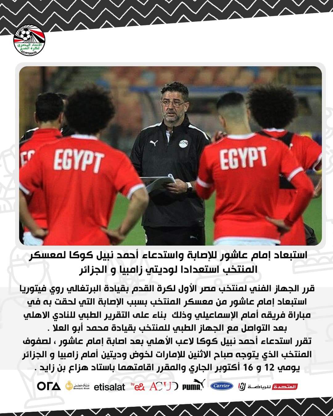 قرر البرتغالي روي فيتوريا، المدير الفني لمنتخب مصر، استدعاء أحمد نبيل كوكا، لاعب خط وسط الأهلي، ليحل محل إمام عاشور، في قائمة معسكر أكتوبر.