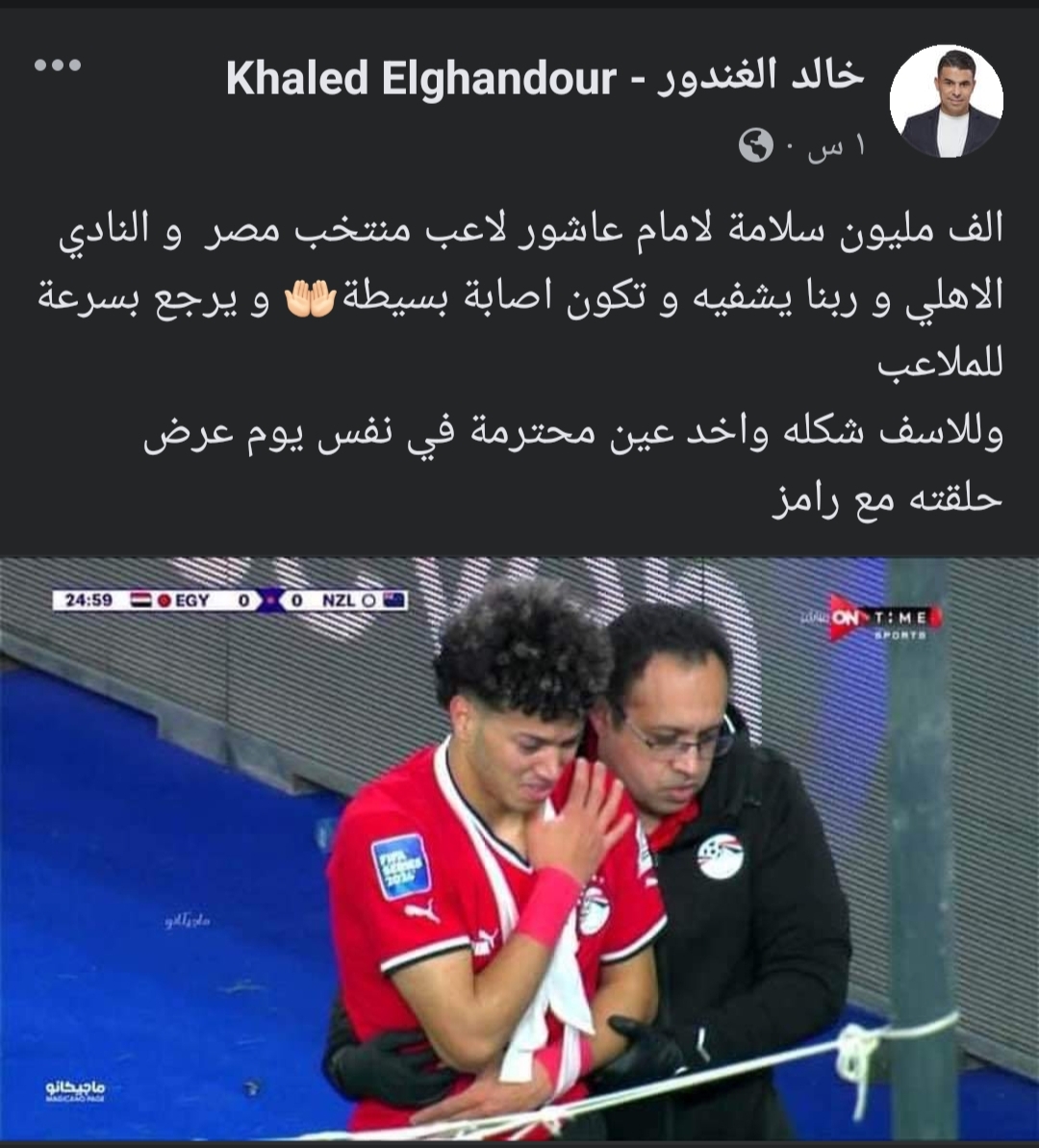 وكتب الغندور عبر حسابه الرسمي على موقع التواصل الاجتماعي “فيس بوك:” ألف مليون سلامة لـ إمام عاشور لاعب منتخب مصر و النادي الاهلي”.