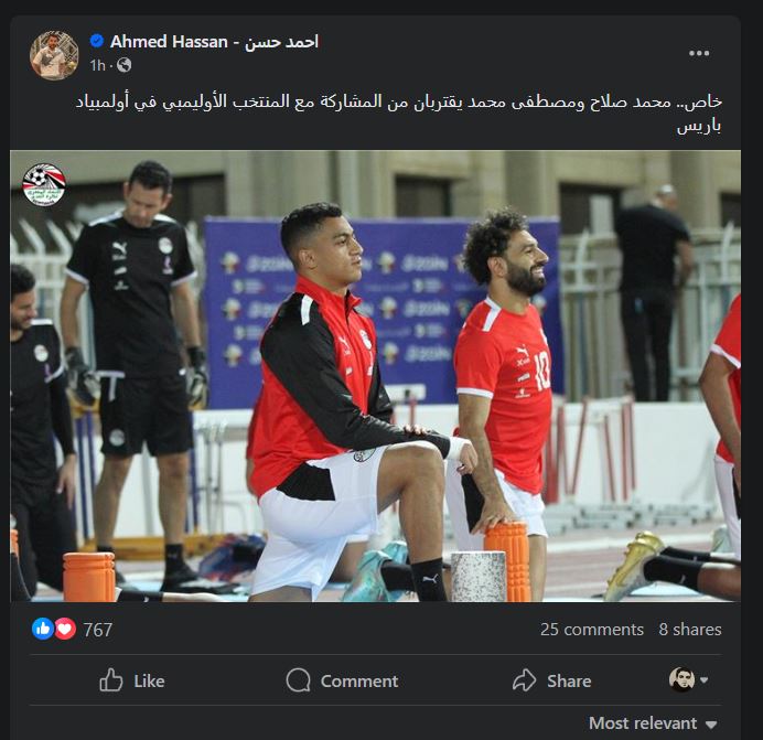 وكتب أحمد حسن، عبر حسابه الشخصي على فيسبوك: “خاص.. محمد صلاح ومصطفى محمد يقتربان من المشاركة مع المنتخب الأولمبي في أولمبياد باريس”.