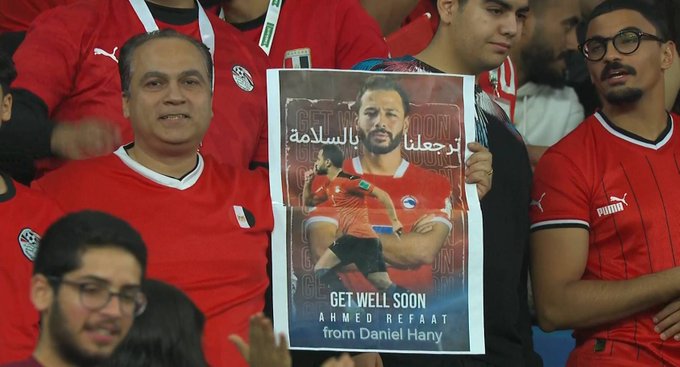 وقامت جماهير منتخب مصر برفع لافتة تحمل صورة أحمد رفعت، وكتبت عليها:”ترجعلنا بالسلامة”، بعد الوعكة الصحية التي تعرض لها.