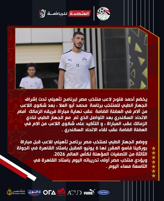 منتخب مصر يعلن خضوع أحمد فتوح لبرنامج تأهيلي