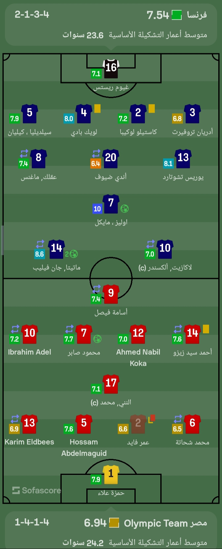 وسجل هدف منتخب مصر الأولمبي محمود صابر في الدقيقة 62، بينما أحرز ثلاثية منتخب فرنسا، جون فيليب ماتيتا “هدفان” في الدقيقة 83 و99، ومايكل أوليز في الدقيقة 108.
