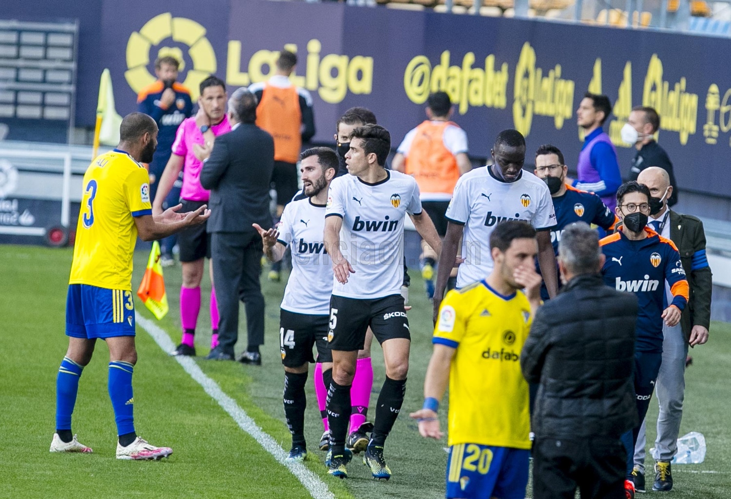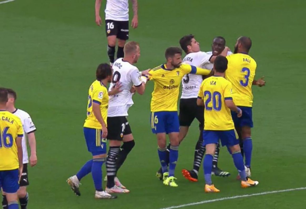 غادر لاعبي فالنسيا ملعب مباراتهم أمام قادش في الدقيقة 33 من عمر المباراة التي تجمع بينهم الآن لحساب لقاءات الجولة التاسعة والعشرون من بطولة الدوري الإسباني، وذلك بعد اشتباك دياكابي لاعب فالنسيا وخوان كالا لاعب قادش.
