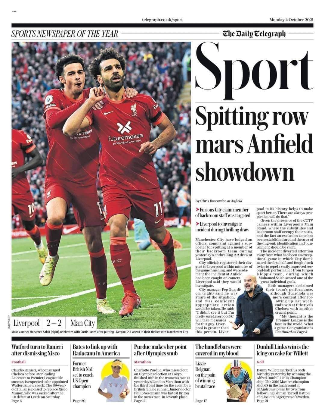 فيما جاء غلاف صحيفة تيليجراف”: “حادثة البصق تجتاح موقعة آنفيلد بين ليفربول والسيتي، تعادل مثير، السيتي الغاضب يزعم أن أحد أفراد طاقمه اُستهدف، ليفربول سيحقق في الحادثة”.