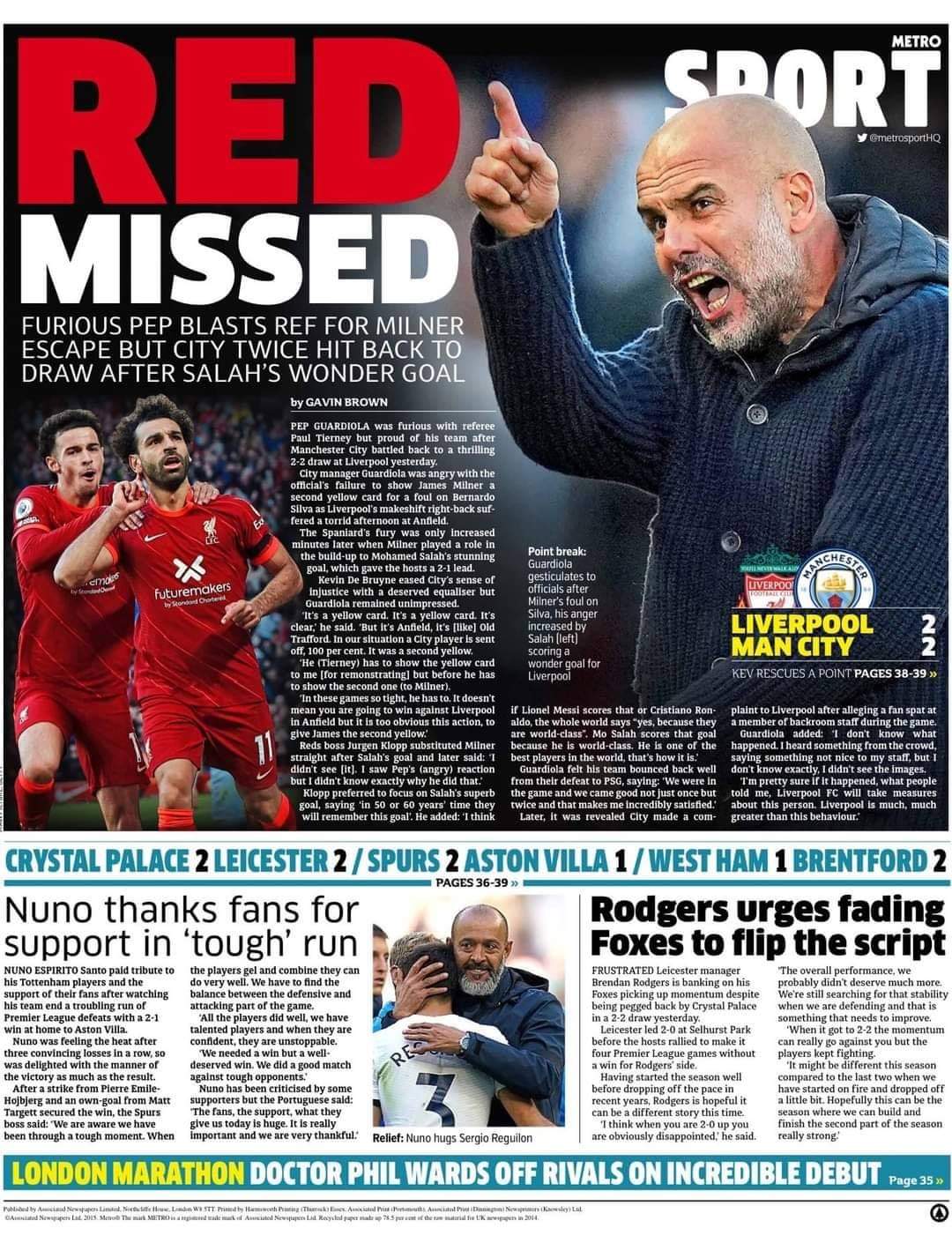 وأخيرًا جاء غلاف صحيفة “ميترو”: “بطاقة حمراء غائب، بيب الغاضب يشن هجومًا على الحكم لعدم طرد ميلنر لكن السيتي يسجل هدفين ليتعادل بعد هدف مذهل من صلاح”.
