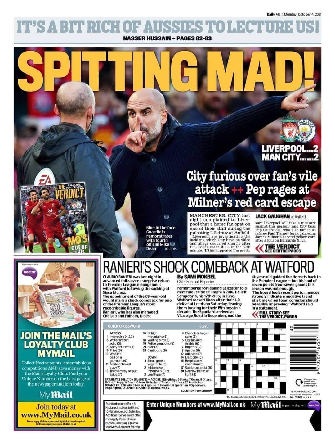 بينما جاء غلاف صحيفة “ستار سبورت”: “الرجل الباصق، غضب كبير حيث أحد مشجعي ليفربول يبصق على دكة السيتي، ميلنر يتجنب البطاقة الحمراء ويترك بيب غاضبًا”.