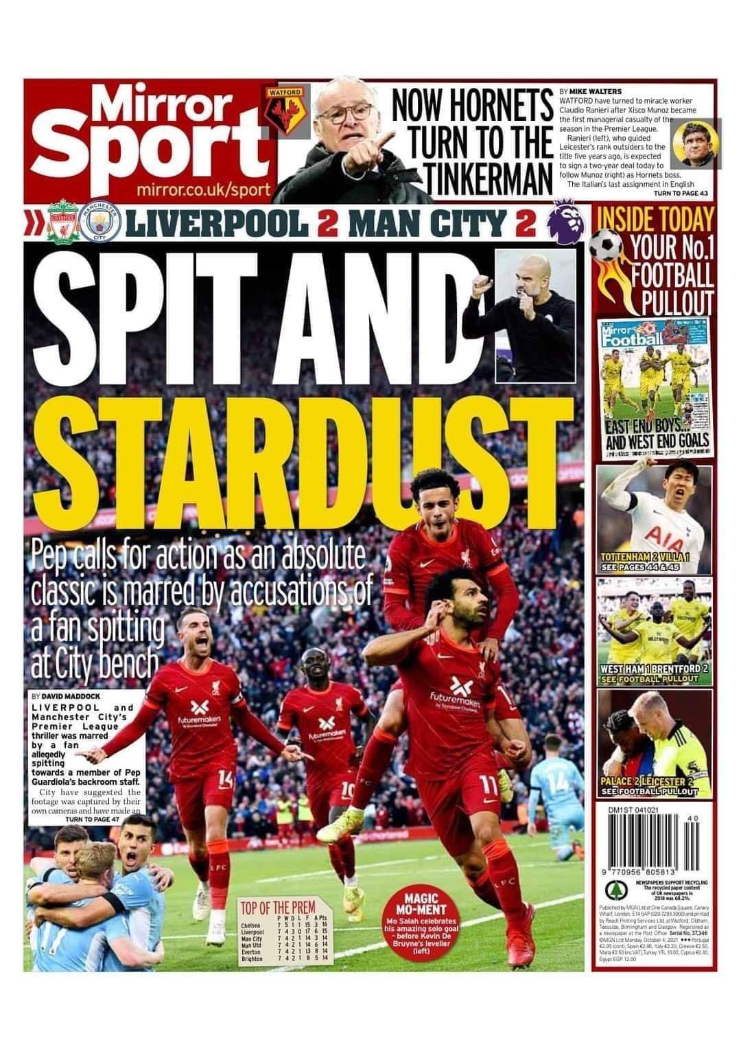 فيما جاء غلاف صحيفة تيليجراف”: “حادثة البصق تجتاح موقعة آنفيلد بين ليفربول والسيتي، تعادل مثير، السيتي الغاضب يزعم أن أحد أفراد طاقمه اُستهدف، ليفربول سيحقق في الحادثة”.