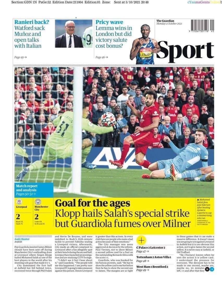 وعنون غلاف صحيفة “جارديان”: “هدف للتاريخ، كلوب يمتدح هدف صلاح المميز، وبيب غاضب من ميلنر”.