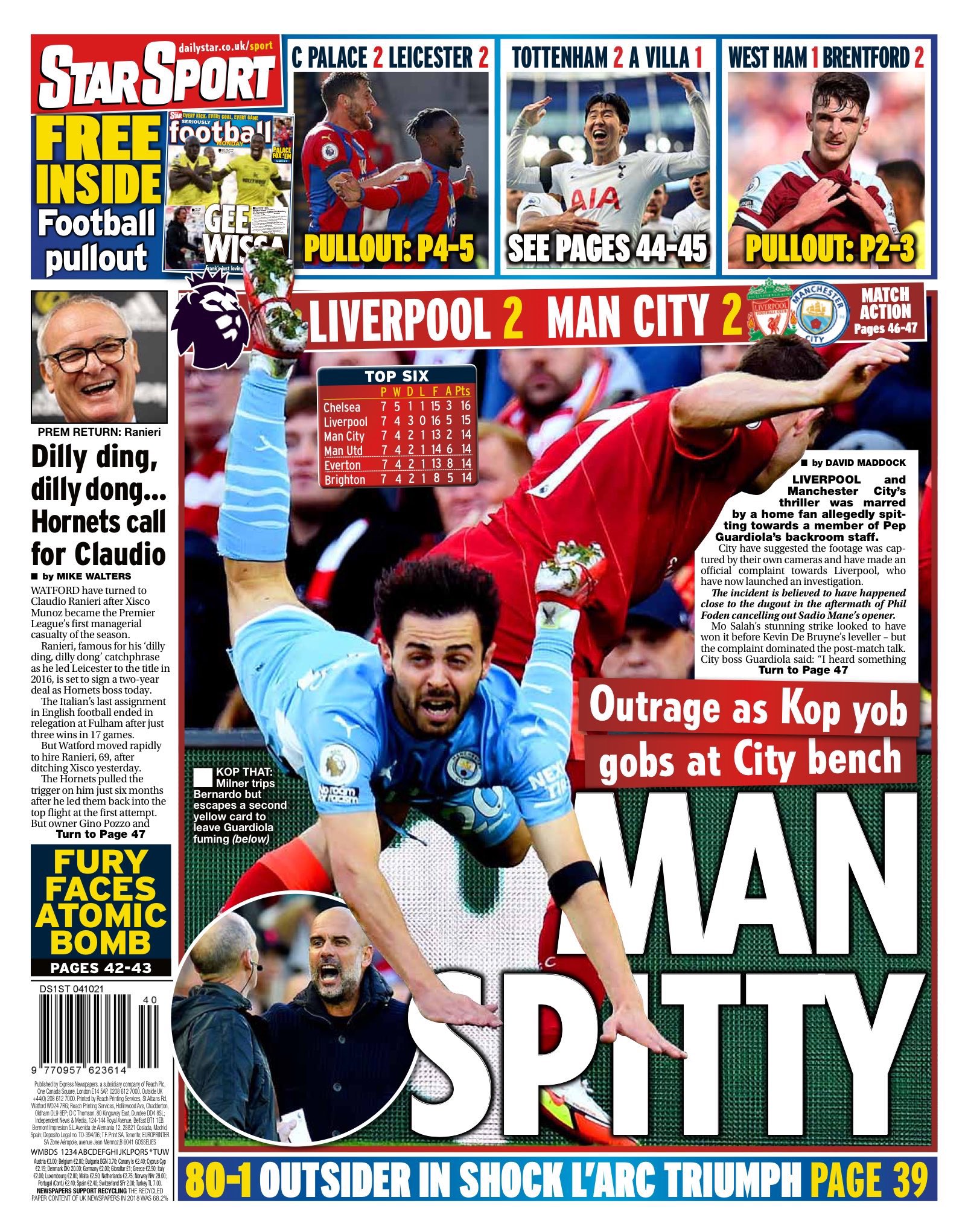 بينما جاء غلاف صحيفة “ستار سبورت”: “الرجل الباصق، غضب كبير حيث أحد مشجعي ليفربول يبصق على دكة السيتي، ميلنر يتجنب البطاقة الحمراء ويترك بيب غاضبًا”.