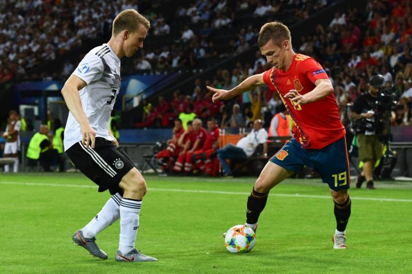 (FILES) In this file photo taken on June 30, 2019, Spain's forward Dani Olmo (R) challenges Germany's defender Lukas Klostermann during the final match of the UEFA U21 European Football Championships between Spain and Germany at the Friuli stadium in Udine. - As it was announced on January 24, 2020, German first division Bundesliga club RB Leipzig has recruited Olmo from Dinamo Zagreb. (Photo by Miguel MEDINA / AFP)