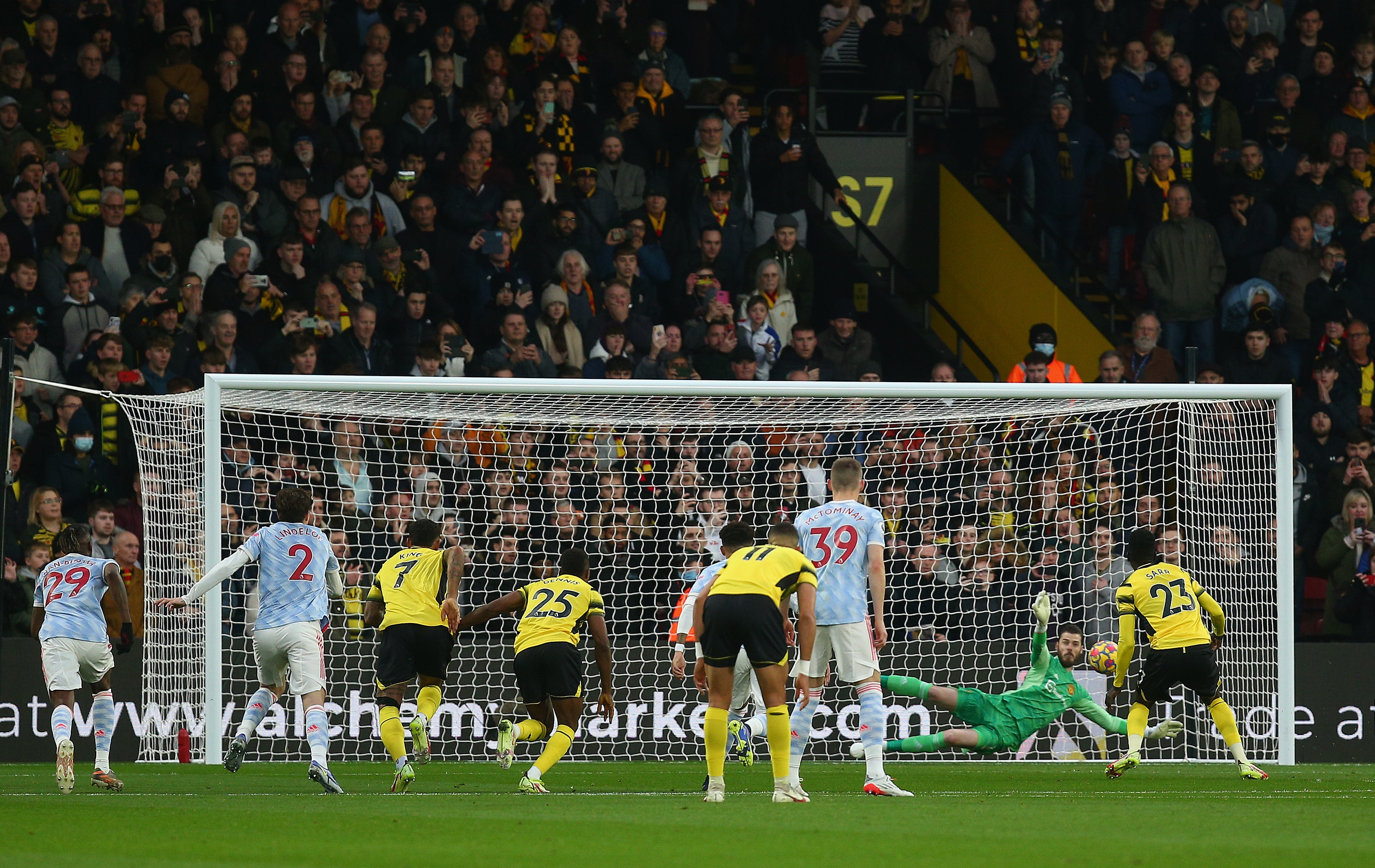 وفي الدقيقة 9 تم إعادة ركلة الجزاء ليتصدى لها دي خيا بطريقة رائعة ويمنع تقدم واتفورد على الشياطين الحمر.